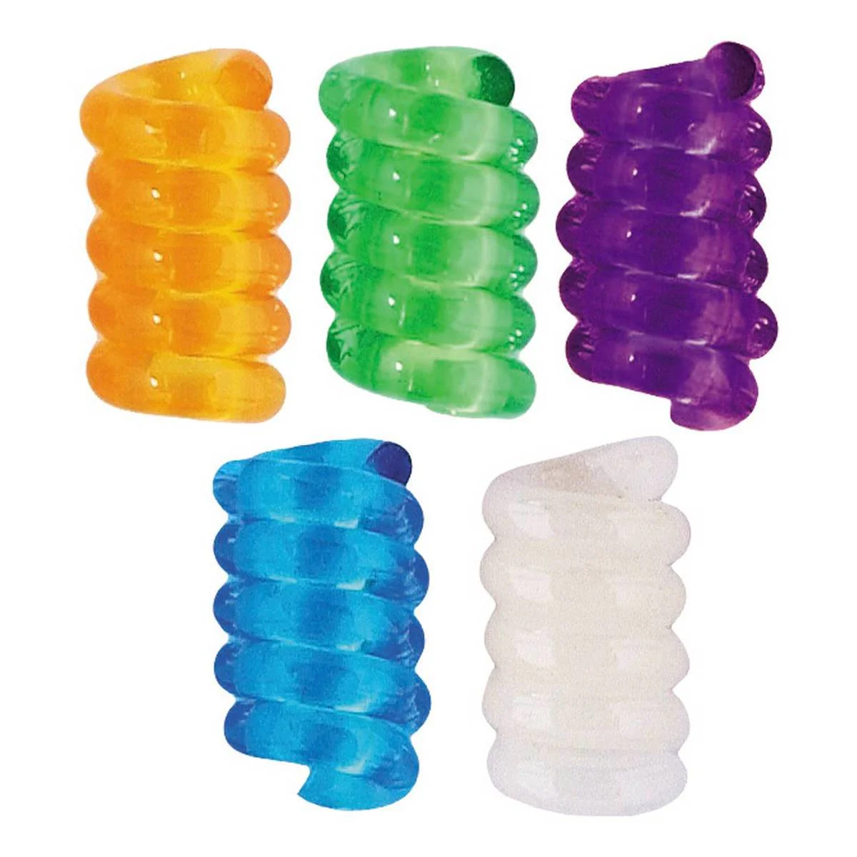 5 spiralės formos laikikliai violetinės, žalios, baltos, mėlynos ir oranžinės spalvos.