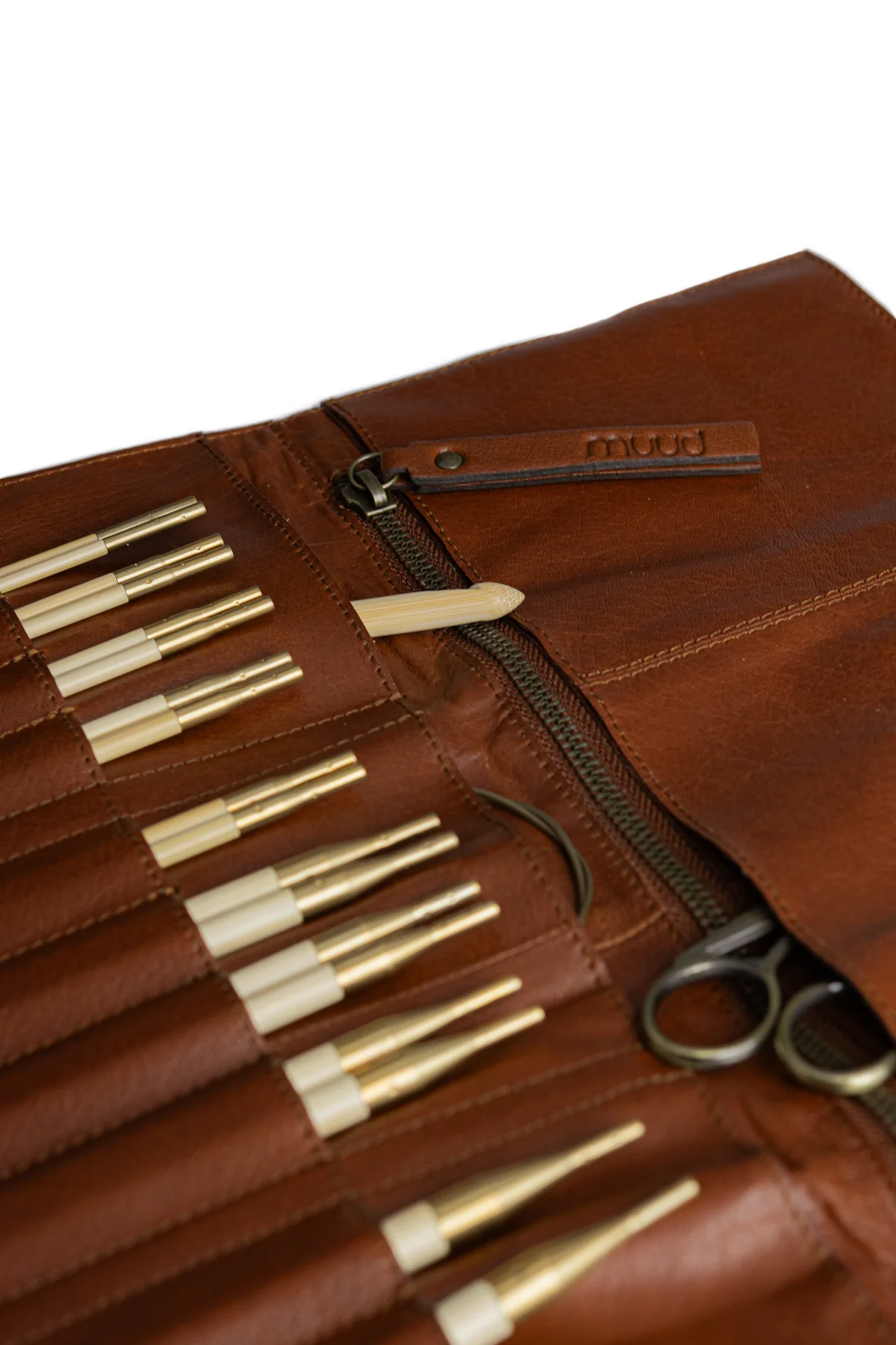 Чехол ручной работы изготовлен из высококачественной натуральной кожи, которая со временем становится ещё привлекательнее. Продуманная конструкция гарантирует, что все спицы и аксессуары будут на своих местах. Чехол вмещает 12 пар разъемных спиц(от 3 мм до 8 мм), три кармана для лесок и один большой карман на молнии для мелких предметов - ножниц, линейки или маркеров.